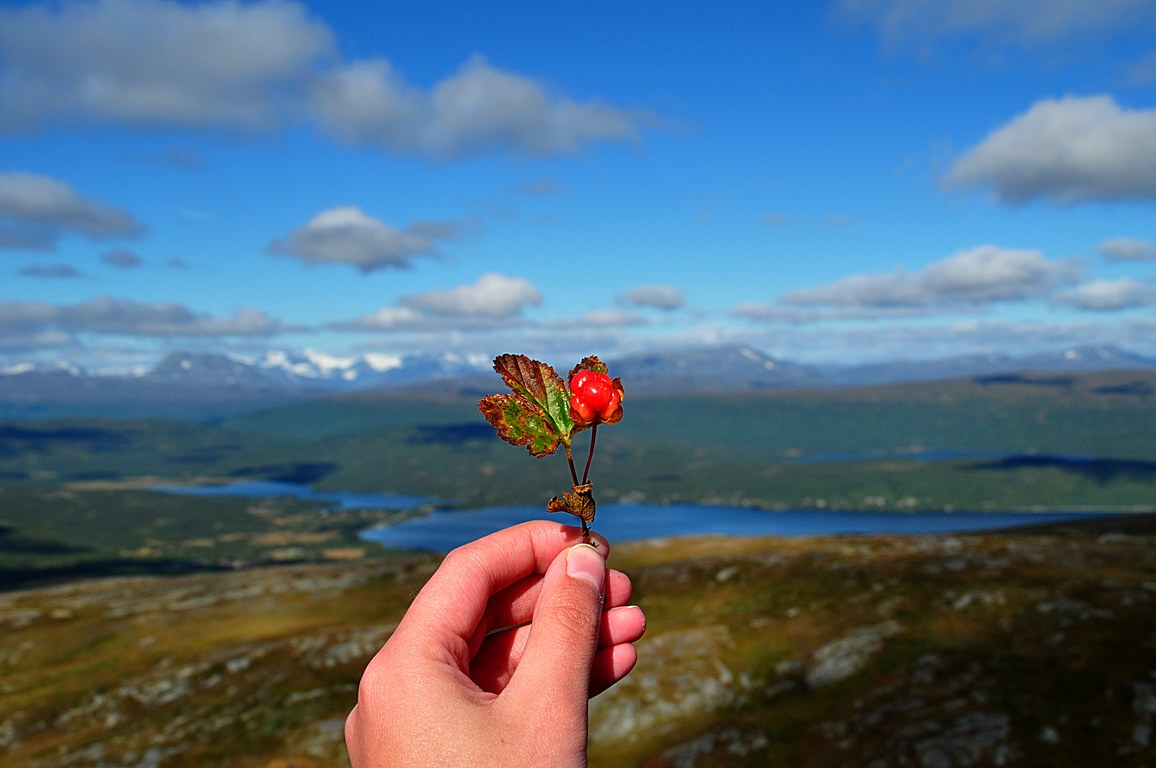 Schodząc z góry znalazłam samotnie rosnącą malinę moroszkę – luksusowy towar i symbol Skandynawii. Można powiedzieć, że Finowie płacą nią do dziś, ponieważ jej wizerunek dumnie błyszczy na monecie o nominale 2 euro. Z kolei firma Neutrogena używa maliny nordyckiej w tajemniczej, norweskiej formule używanej w kosmetykach. W Szwecji malinę moroszkę można dostać m.in. w postaci dżemu, który kosztuje w granicach 30 zł za około 350 g. Podczas gdy w północnej części Europy malina moroszka cieszy się niesłabnącą popularnością i pozycją rarytasu, w naszym ojczystym kraju kusi jak zakazany owoc. Znalazła swoje miejsce, ale niestety w Polskiej Czerwonej Księdze Roślin jako relikt epoki lodowcowej. Kolejna ciekawostka: kiedy nam czerwony kolor owoców kojarzy się z soczystym, dojrzałym wnętrzem, tutaj świadczy o czymś zupełnie przeciwnym. Gotowa do zjedzenia malina moroszka jest w kolorze… żółtym 🙂