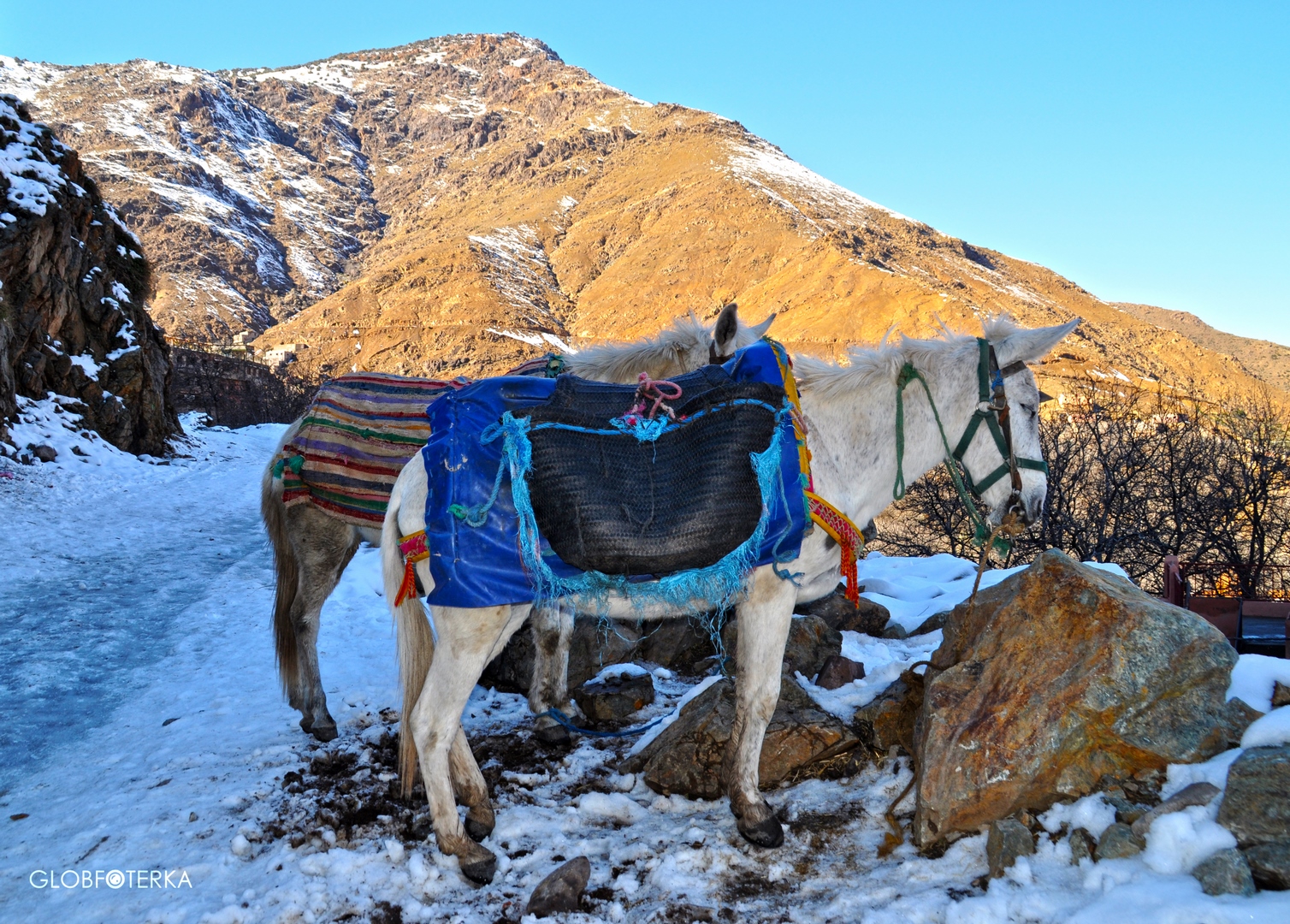 Imlil przypomina bardziej niewielką wieś niż tętniące życiem miasto. To przede wszystkim górski ośrodek turystyczny i baza wypadowa na Jebel Toubkal. Można tam kupić niezbędny do trekkingu w Atlasie Wysokim sprzęt, wynająć przewodnika czy odpocząć po zdobyciu dachu Maroka. Wśród turystów przeważają profesjonalnie wyglądający górołazi, ale nie brakuje też zwykłych podróżników, którzy chcieli odpocząć od zgiełku w Marrakeszu i nasycić się pięknymi widokami. Zdecydowanie warto tam pojechać nawet dla samych krajobrazów. Spotkaliśmy nawet grupę Brytyjczyków z małymi, ledwo wchodzącymi pod oblodzoną górkę dziećmi. Muły aż uginały się od niezliczonych bagażów i opasłych walizek. Nie wiem, co trzeba spakować, żeby mieć tyle nieporęcznego balastu… Samo miasteczko nie jest zbyt urokliwe i robi dość mierne wrażenie. Nie brakuje w nim wszechobecnych bezdomnych i wygłodniałych kotów, ani otwartych rzeźni z wiszącymi na widoku udźcami.