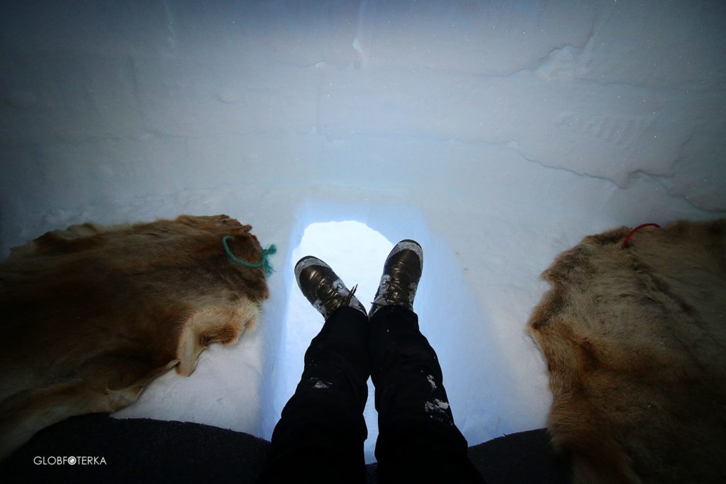 Najbardziej charakterystyczną cechą igloo jest jego okrągła budowa. Małych rozmiarów wejście jest ulokowane tak nisko, że trzeba się przeczołgać, żeby wejść do środka. Dzięki temu lodowate zimno zostaje na zewnątrz, a do wnętrza igloo wpada tylko chłodek ?. Podłoga wyłożona jest skórami z renifera i matami, więc nie śpi się na gołym śniegu. Igloo może pomieścić od 2 do 4 osób. Im więcej ludzi w środku, tym cieplej.