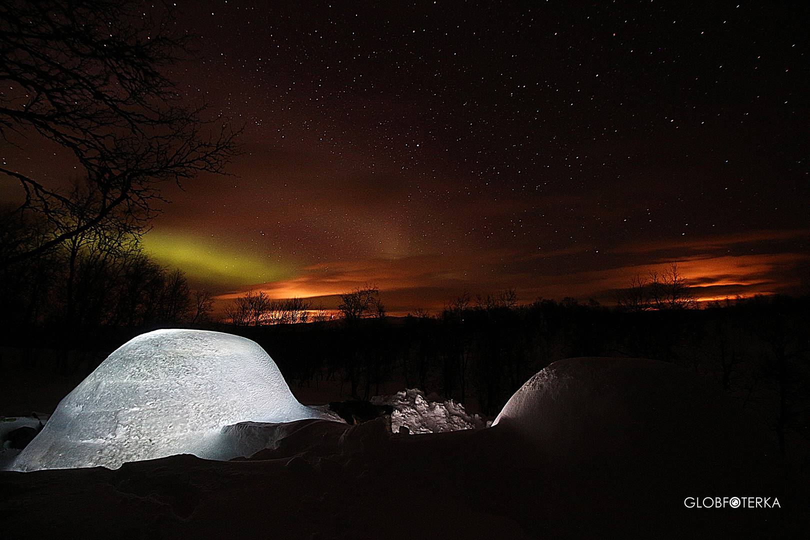 Temperatura w środku igloo zależy od warunków panujących na zewnątrz. Jeśli na polu jest więc około -10 stopni, to wewnątrz może być nawet kilka na plusie. W tym typie igloo nie można rozpalić ogniska w środku. Największa różnica temperatury, jaką przeżył Peder to -35 na zewnątrz i 13+ w środku. Nieźle, prawda? Takie temperatury mogą panować od stycznia do maja, kiedy to możliwe jest nocowanie w igloo w Laponii.
